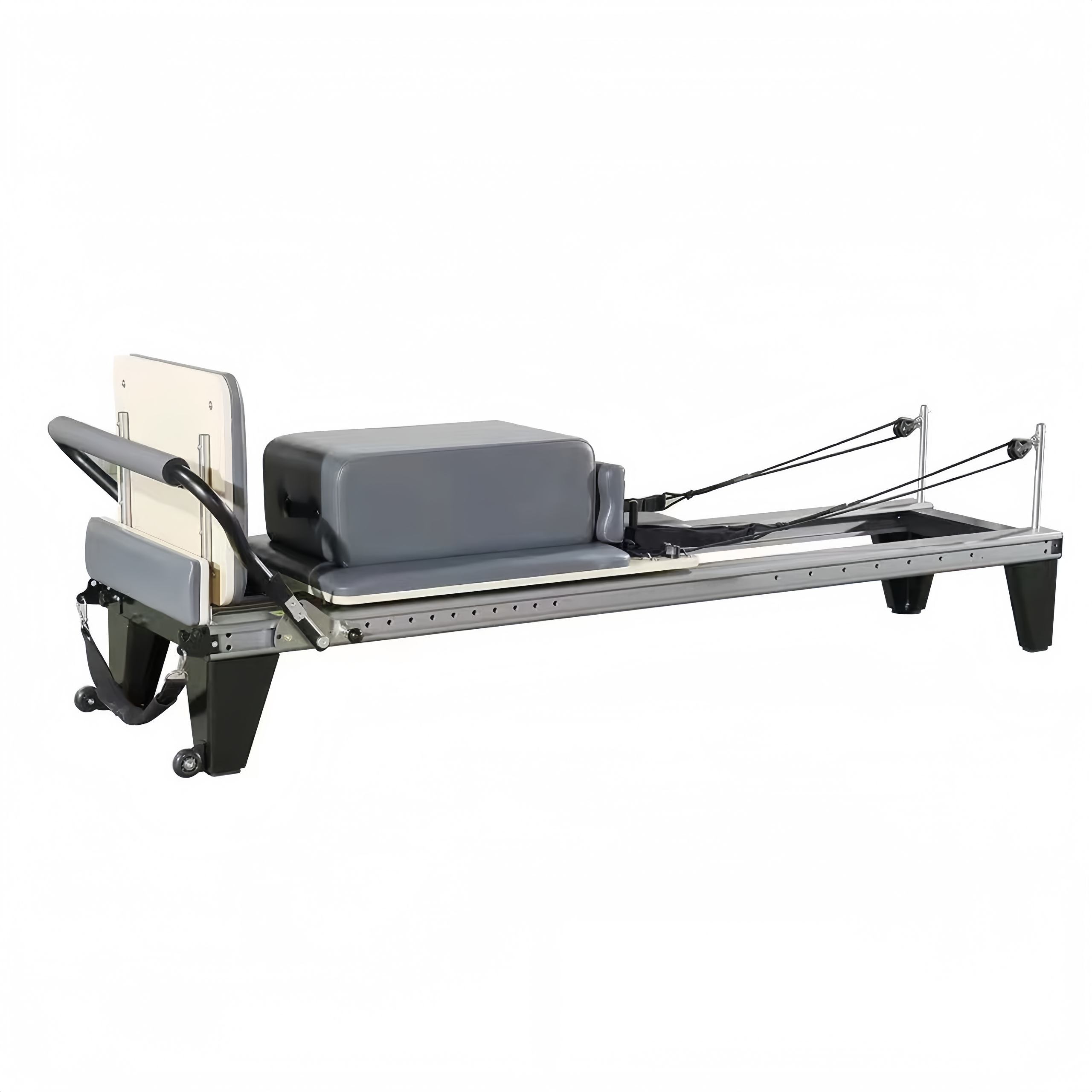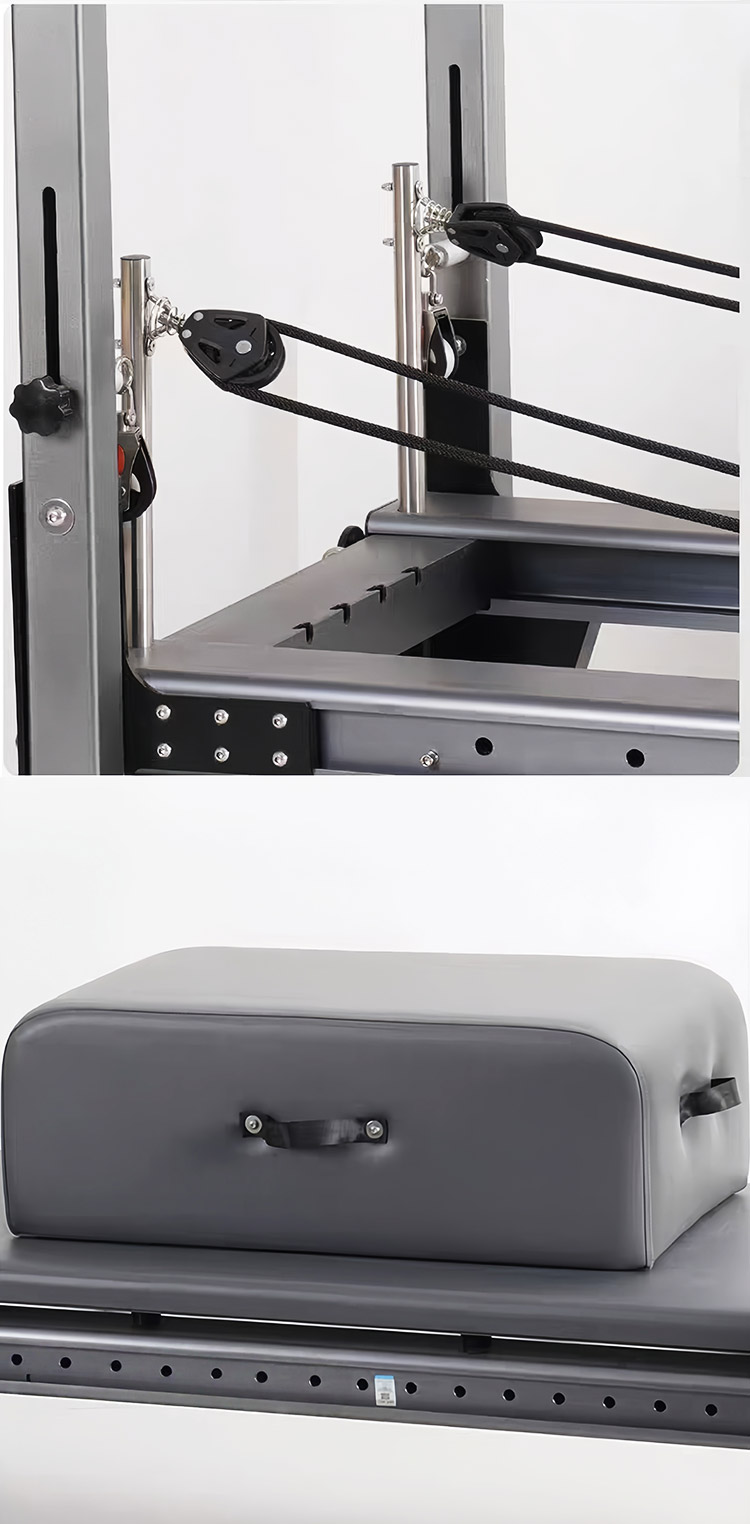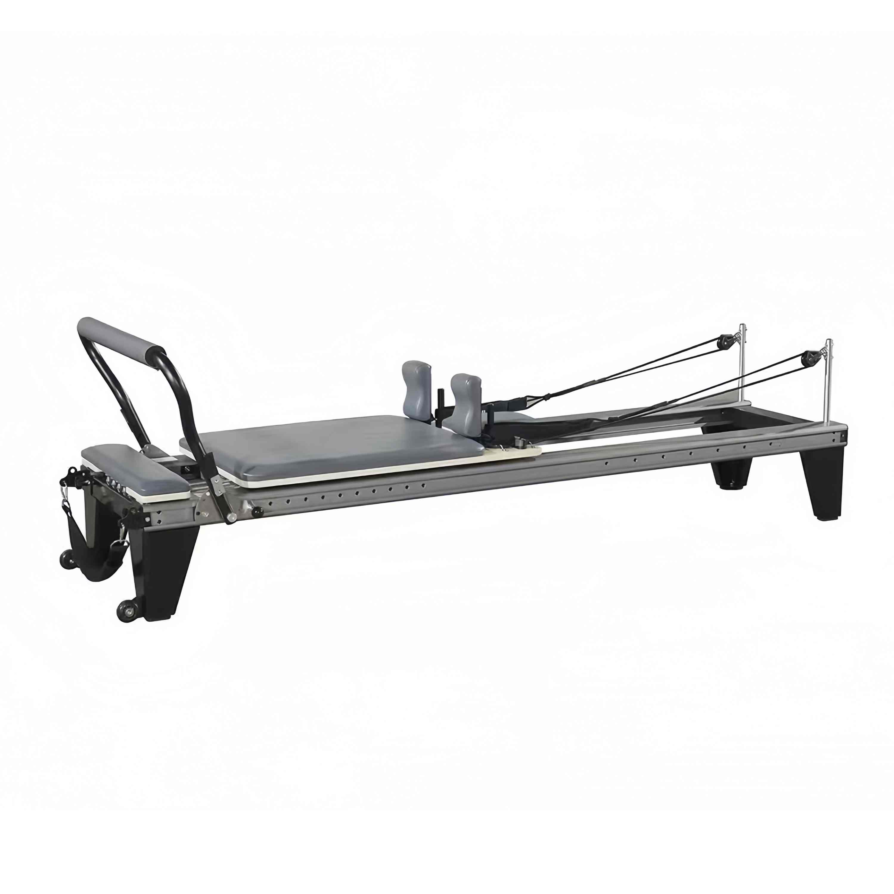 Built for long-term professional use, the Aluminum Reformer incorporates a scratch-resistant electrostatic powder coating on the aluminum alloy frame, resisting corrosion, wear, and sweat. It features ergonomic details such as adjustable footrests, multi-position handles, and high-elasticity non-slip cushions to fit all body types, ensuring maximum comfort during training. Carriage grid lines assist in precise movement alignment, while non-slip foot platforms, anti-detachment pulleys, and stable support legs guarantee safe and wobble-free training with no noise disturbance.