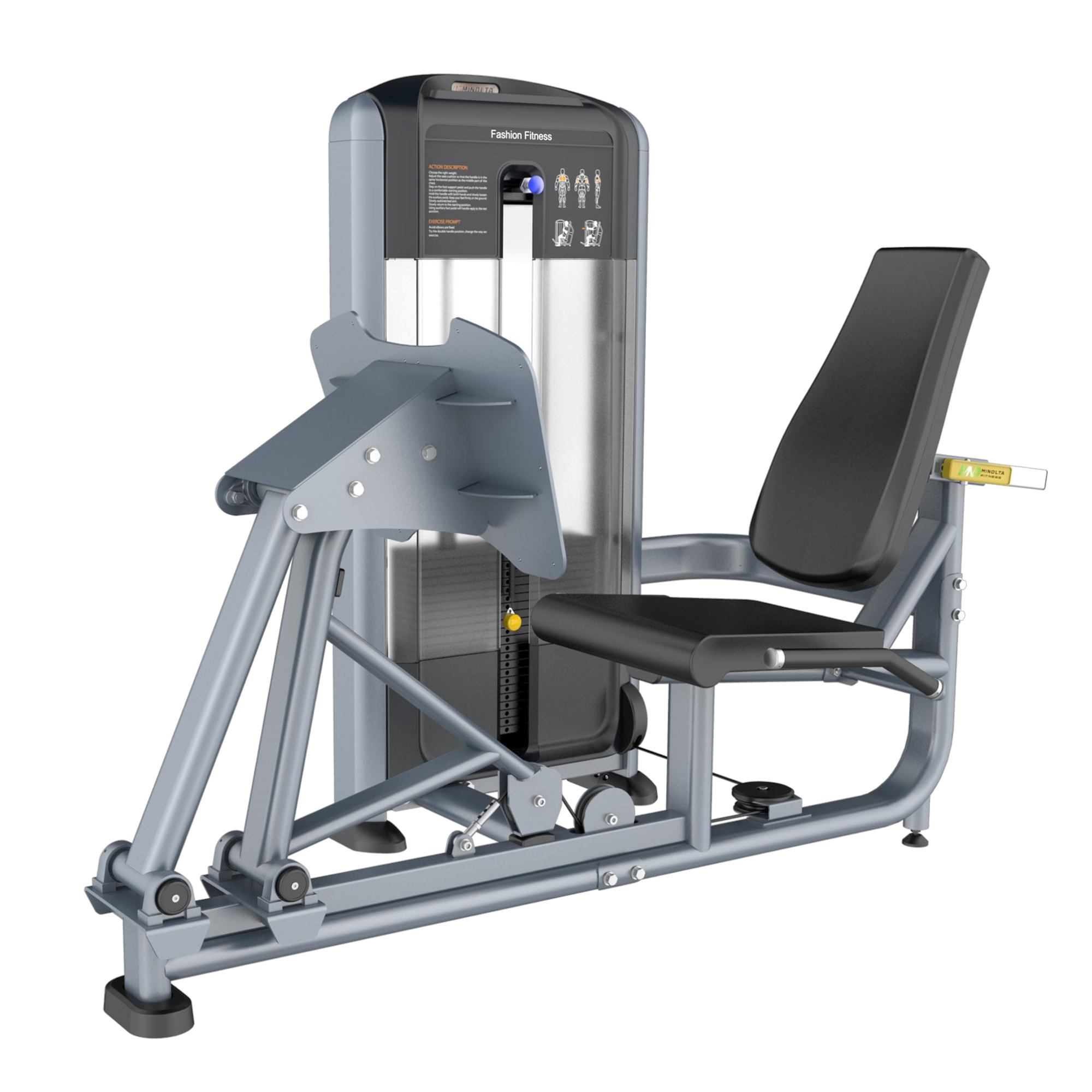 The core frame of the whole machine is built in strict accordance with the established specifications, with layered quality control: the counterweight case adopts 53*156*T3mm large D-shaped steel as the frame, and the moving parts are made of 50*100*T3mm flat oval steel tubes, paired with precision seamless welding process, no burrs, no virtual welding, and stable structure with impact resistance; the surface adopts car-grade baking paint process, bright color and high-grade texture, which can achieve long-term rust prevention, sweat resistance and corrosion resistance, adapting to the humid and sweaty use environment of the gym. The protective cover is made of reinforced ABS one-time injection molding, and the handle decorative cover is made of aluminum alloy, which combines texture and durability, and can easily bear the high-frequency and heavy-weight training needs of the venue.